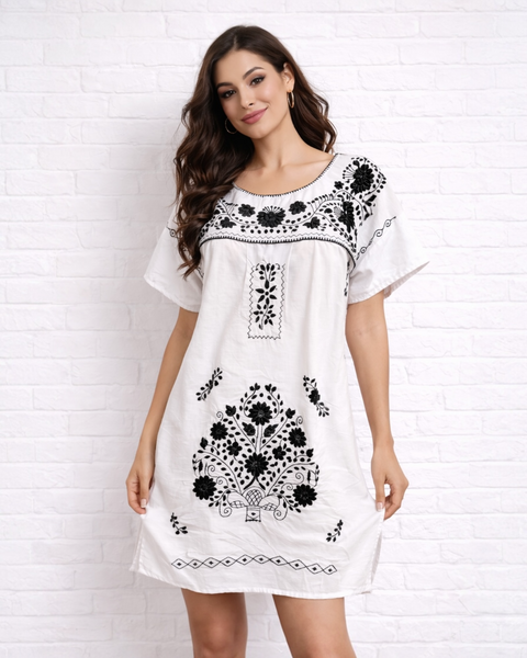 New, handmade midi dress, floral embroidery made by hand 100% by native artisans from Puebla, Mexico.