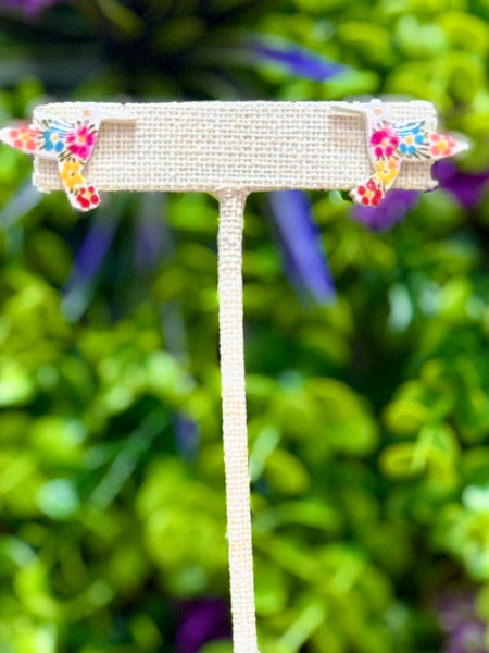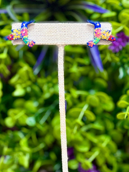 Adorable hand painted wooden earrings featuring the shape of a humminburd, with its colorful floral design makes them a beautiful addition to pair with your Mexican attire or to add a touch of culture to your everyday wardrobe.