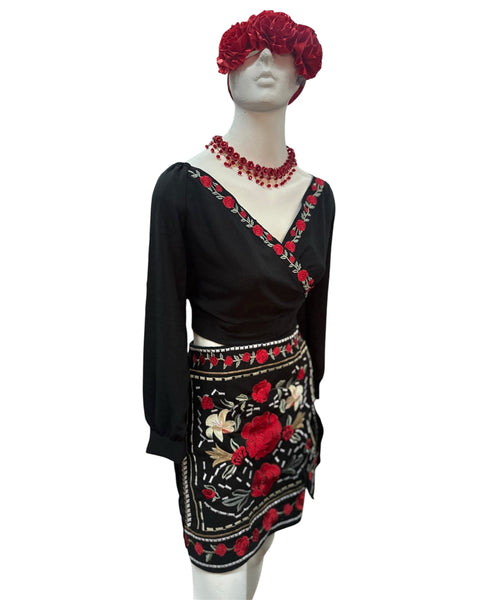 This elegant set features a black stretchable fabric adorned with luxurious silk thread embroidery in red rose patterns. The blouse showcases long sleeves with a charming bow detail at the back, while the skirt exudes stunning beauty.