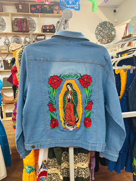 It's a must-have addition to your wardrobe not only for its warmth, but also for its intricate floral embroidery in vibrant colors featuring Our Lady of Guadalupe.