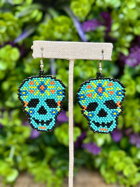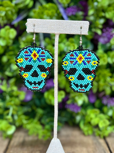 One of a kind earrings handcrafted by skilled artisans, they are made with petite glass beads. Inspired on Sugar Skulls!Picture colors may slight different. Approximately 2.5” tall