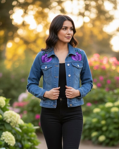 Elevate your look with this gorgeous denim jacket featuring exquisite, traditional Mexican floral embroidery on the back.