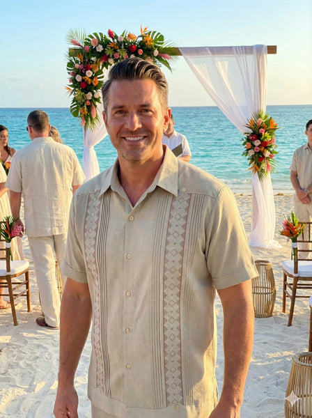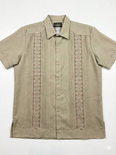 Get ready to stand out in this Men's Linen Guayabera! This short sleeve guayabera features a brown embroidered pattern, adding a touch of Mexican culture to your wardrobe. Made with lightweight linen, this guayabera is perfect for those warm weather days. Upgrade your style game today!