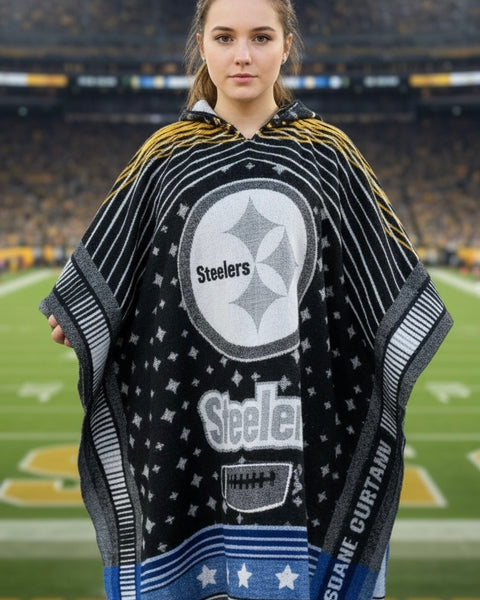 Show your Steelers pride in style with this unique and comfortable knit hooded poncho.