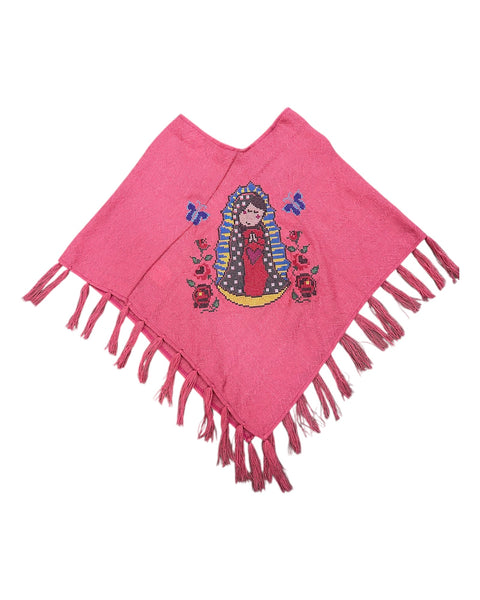Hand woven fringed poncho for girls featuring an embroidered pattern of Our Lady of Guadalupe with a floral frame.